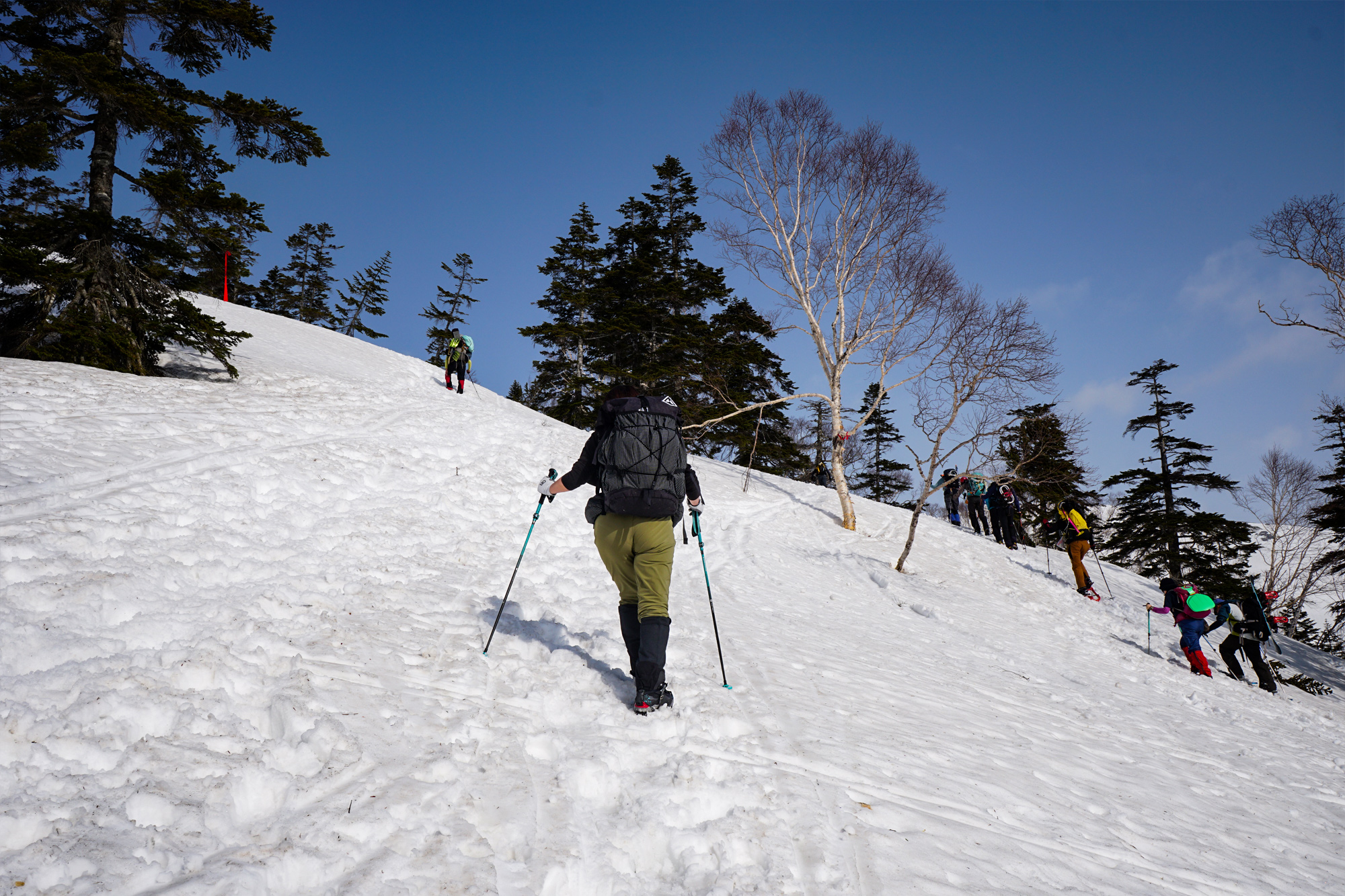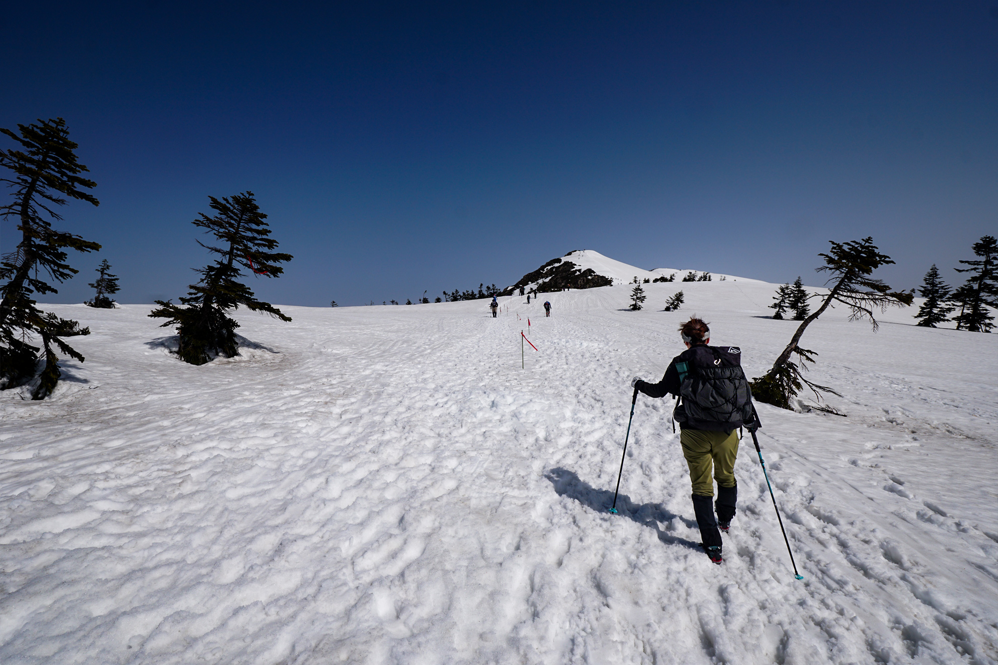 だだっ広い雪原なので悪天候時には迷いそうですが、ポールが有り難いですね。