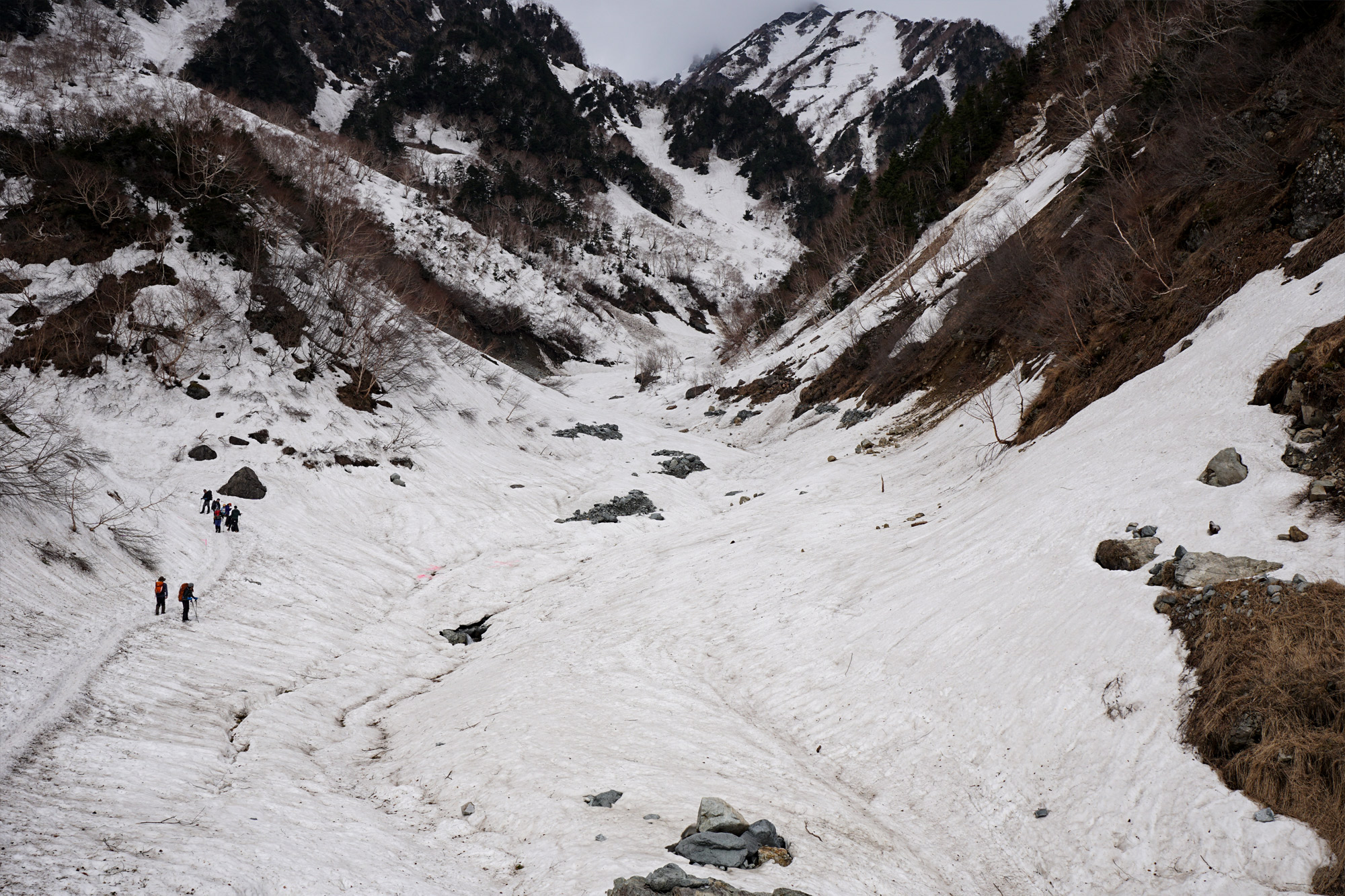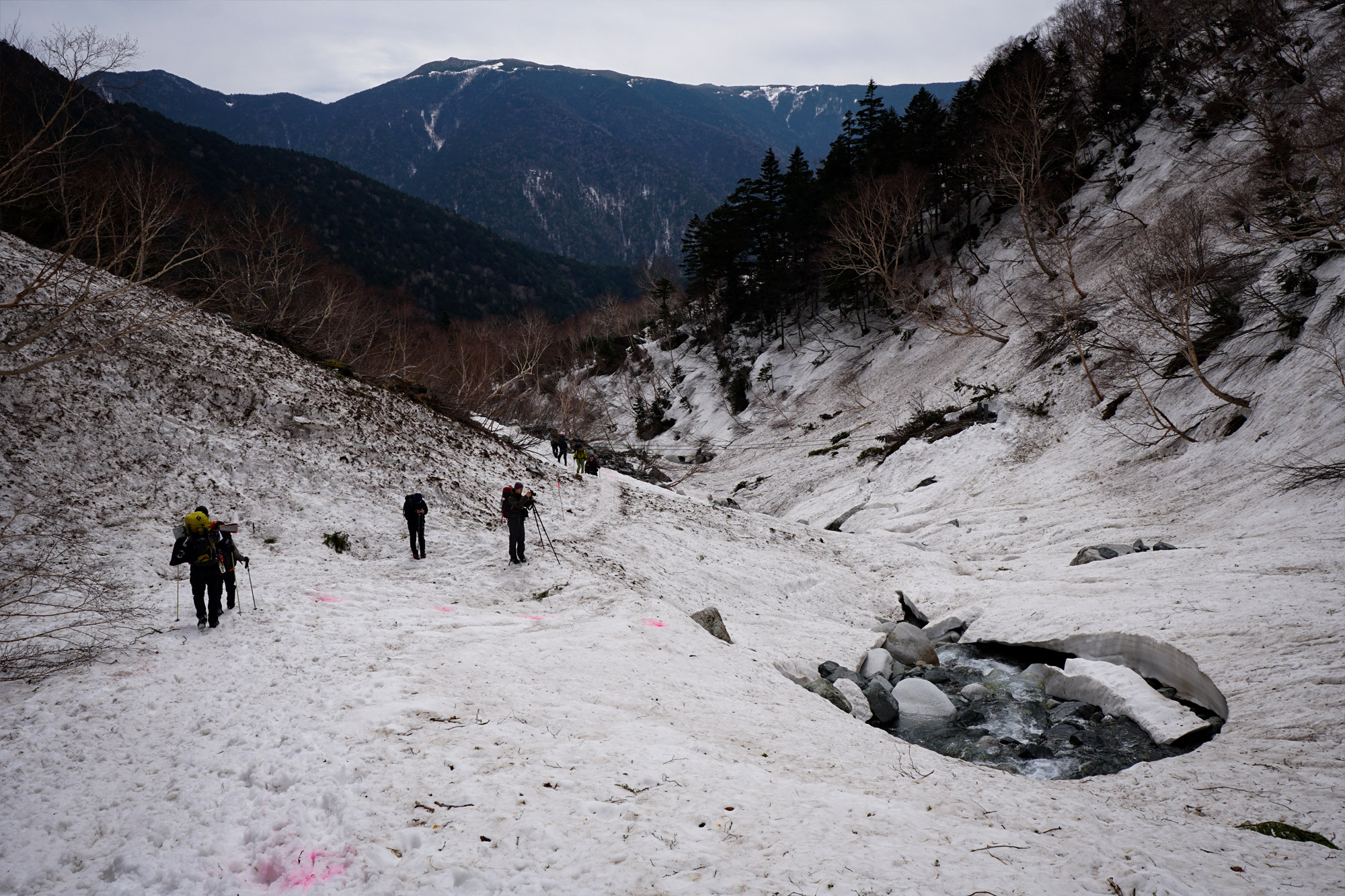既に溶け始めている雪の上、足を取られながら進んでいきますが、昨日は苦労して登ったところも下りは本当に早い。